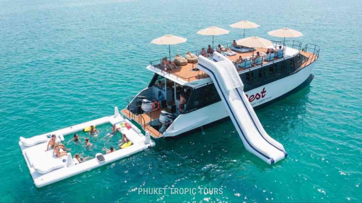 - Закатная чилл-вечеринка у частного острова Майтон (без высадки на остров). Финал, который гости вспоминают дольше всего: горка в море, надувной бассейн, SUP и прозрачные каноэ, купание и снорклинг, коктейли в бамбуковых стаканах — каждый гость получает стакан в подарок, фрукты, снеки и напитки, музыка и лёгкая party-атмосфера, релакс и наслаждение закатом над морем