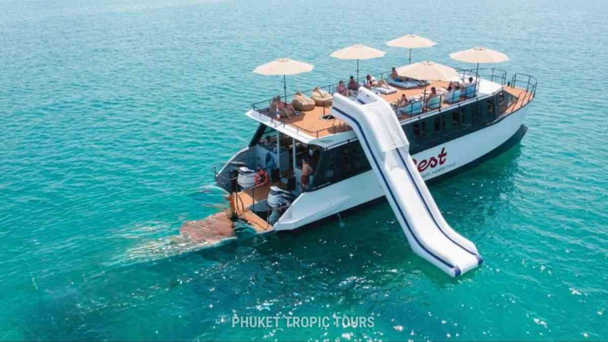 - Закатная чилл-вечеринка у частного острова Майтон (без высадки на остров). Финал, который гости вспоминают дольше всего: горка в море, надувной бассейн, SUP и прозрачные каноэ, купание и снорклинг, коктейли в бамбуковых стаканах — каждый гость получает стакан в подарок, фрукты, снеки и напитки, музыка и лёгкая party-атмосфера, релакс и наслаждение закатом над морем